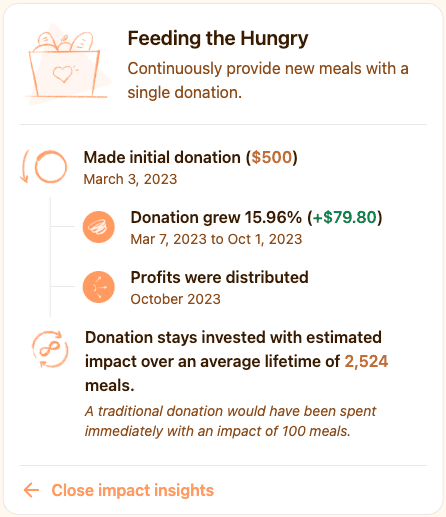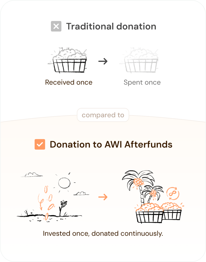 4. Every year the profits made from the growth of funds are distributed to the cause you picked, while the principal (the original amount donated) stays invested to continue multiplying your donation.